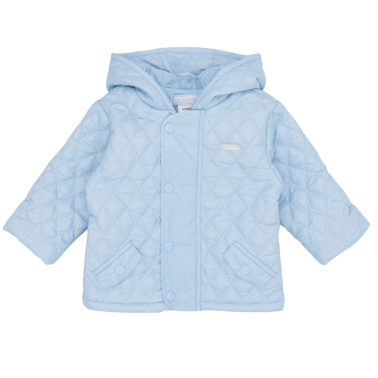 Blue boys quilted jacket with hood. Long sleeves, zip and popper fastening. Fleece inner lining. Perfect to keep little ones warm this Winter season