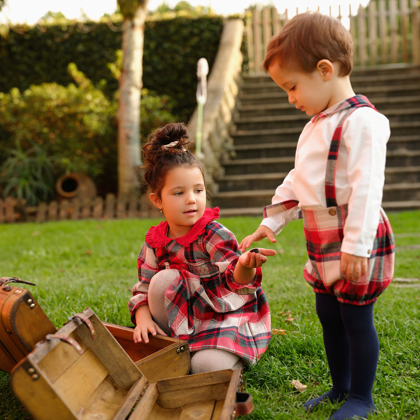 Two piece baby boys Christmas set. Long sleeve white shirt with check collar and button back fastening. The set is completed with check pants with straps.