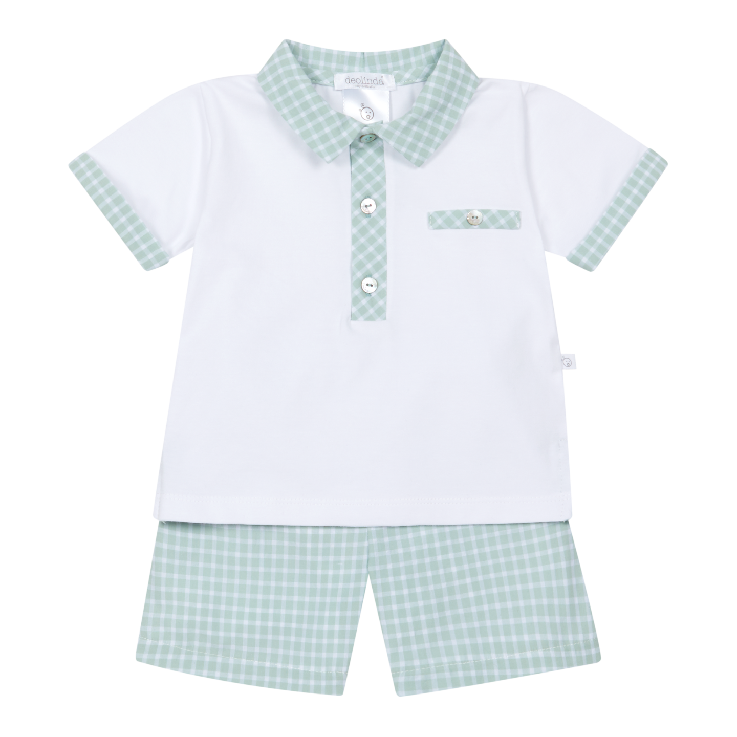 Two piece designer short set. White polo style top with short sleeves and pale green check collar detail. Imitation pocket to chest. Matching pale green check shorts to complete the look.