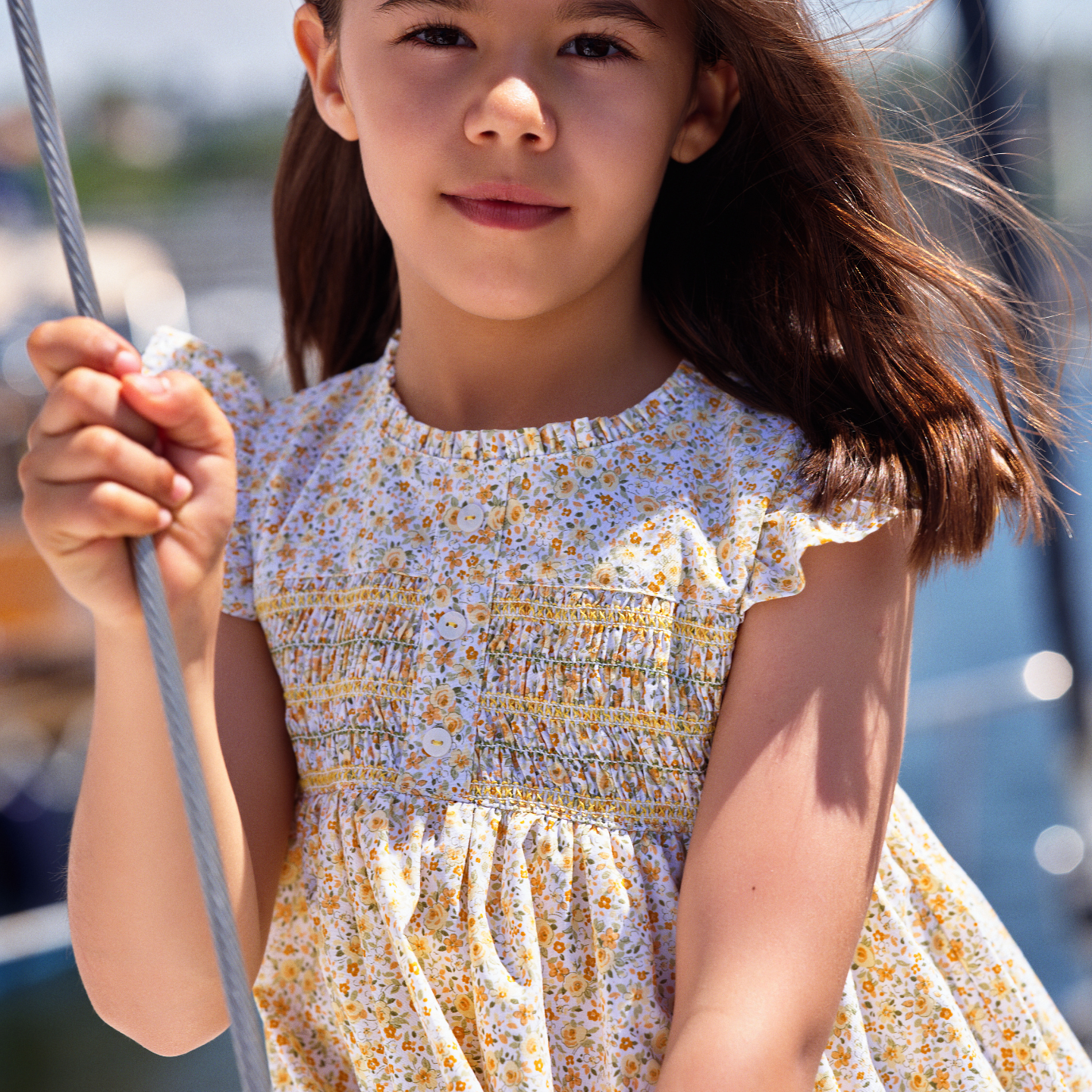 This beautiful girls lemon floral smock dress by Portuguese designer Deolinda is the perfect Spring/Summer look. Designed in a delicate 100% cotton ditsy floral print, fully lined, with smock detail to the chest and zip back fastening.