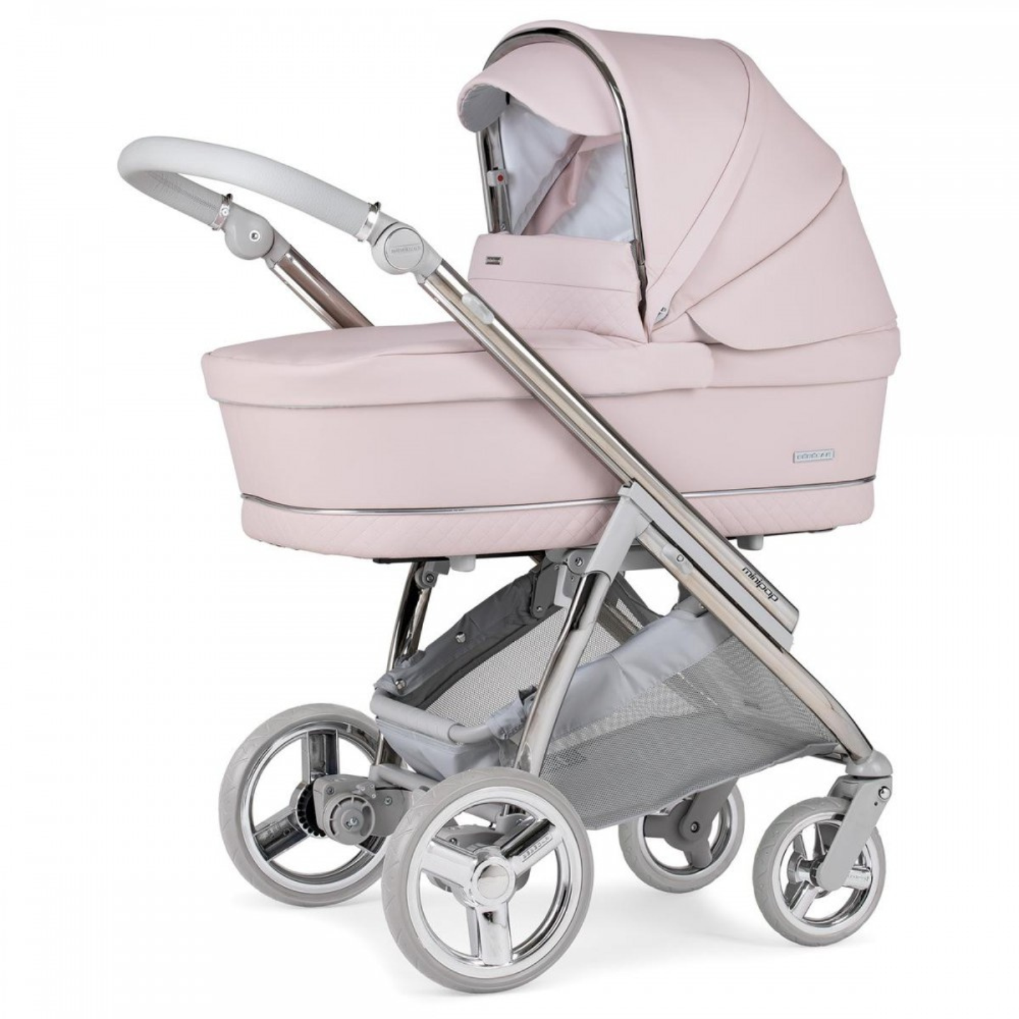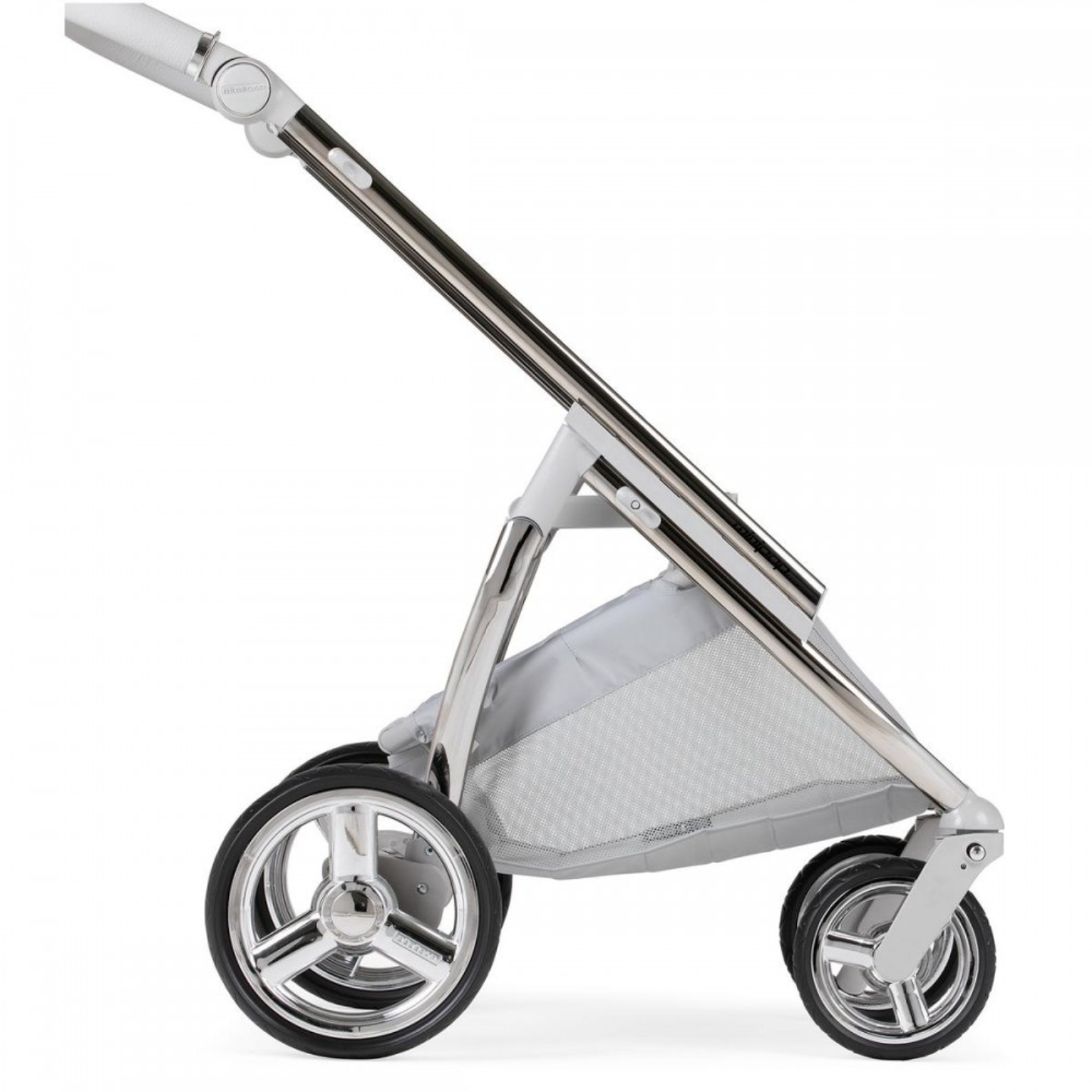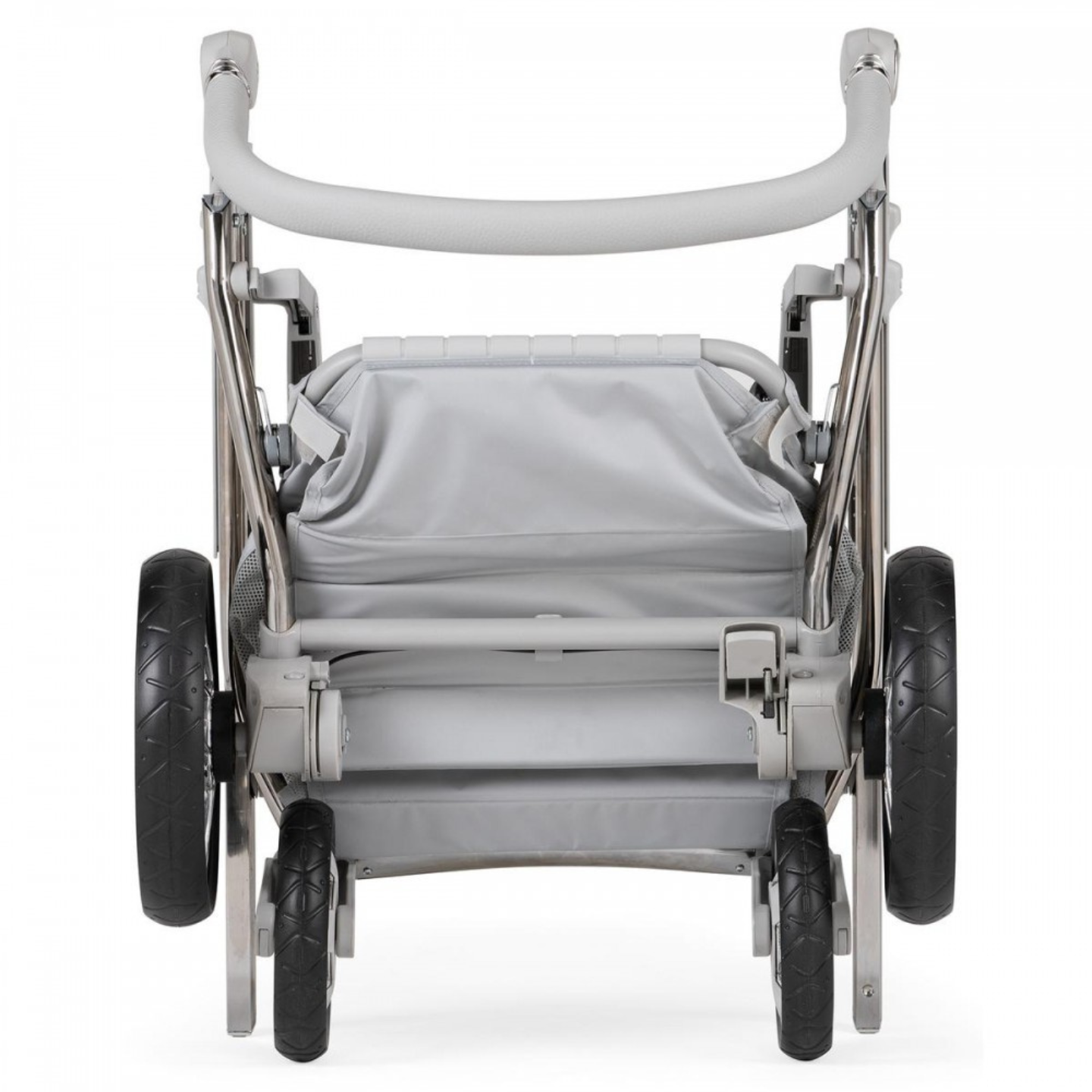 Ultra compact chassis with only 54cms wide. With four wheel suspension and wheels with ball bearings the pram can be manoeuvred with just one hand. The wheels are designed for an agile rise, they facilitate the action of going down and up stairs and absorb bumps, unevenness and irregularities on the surfaces. Easy to open and fold with seat unit attached either way. 7.5kg with basket.