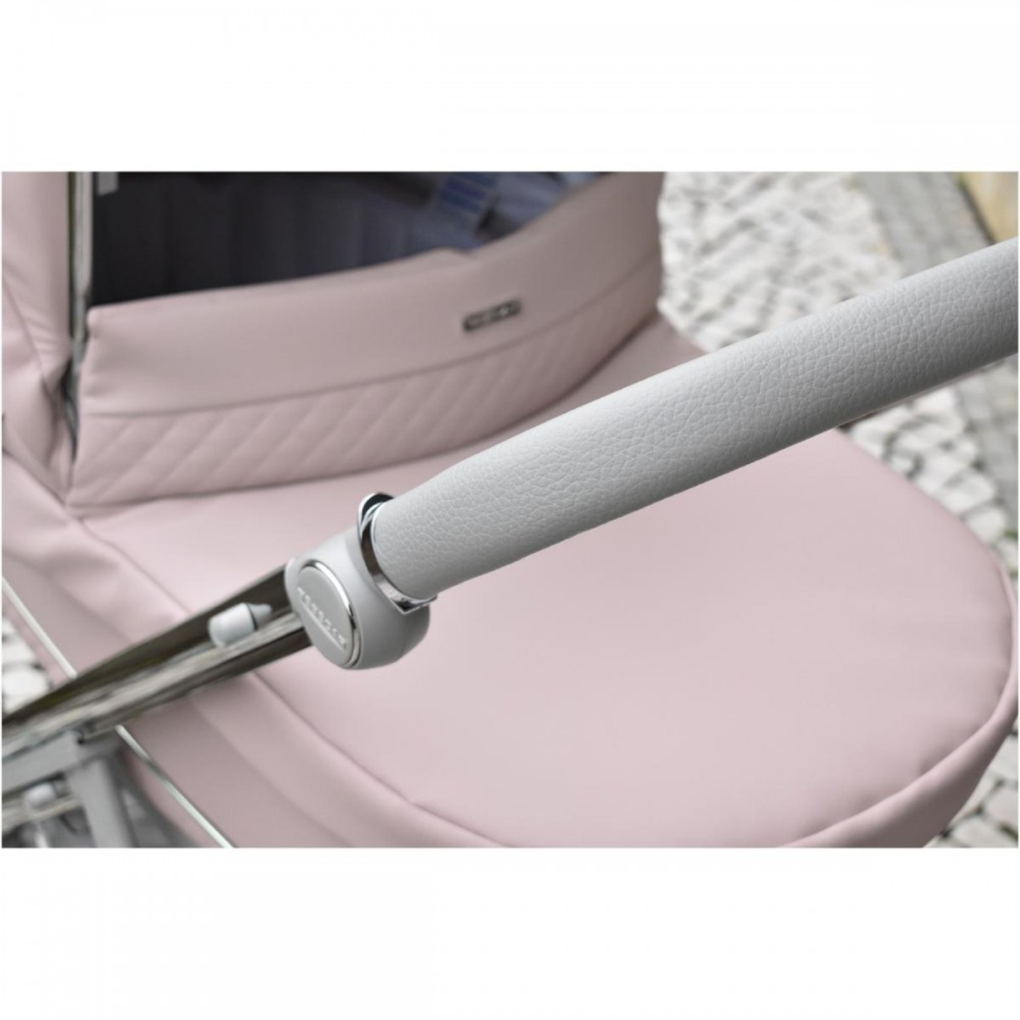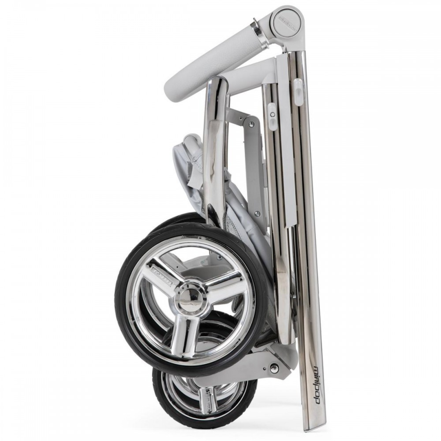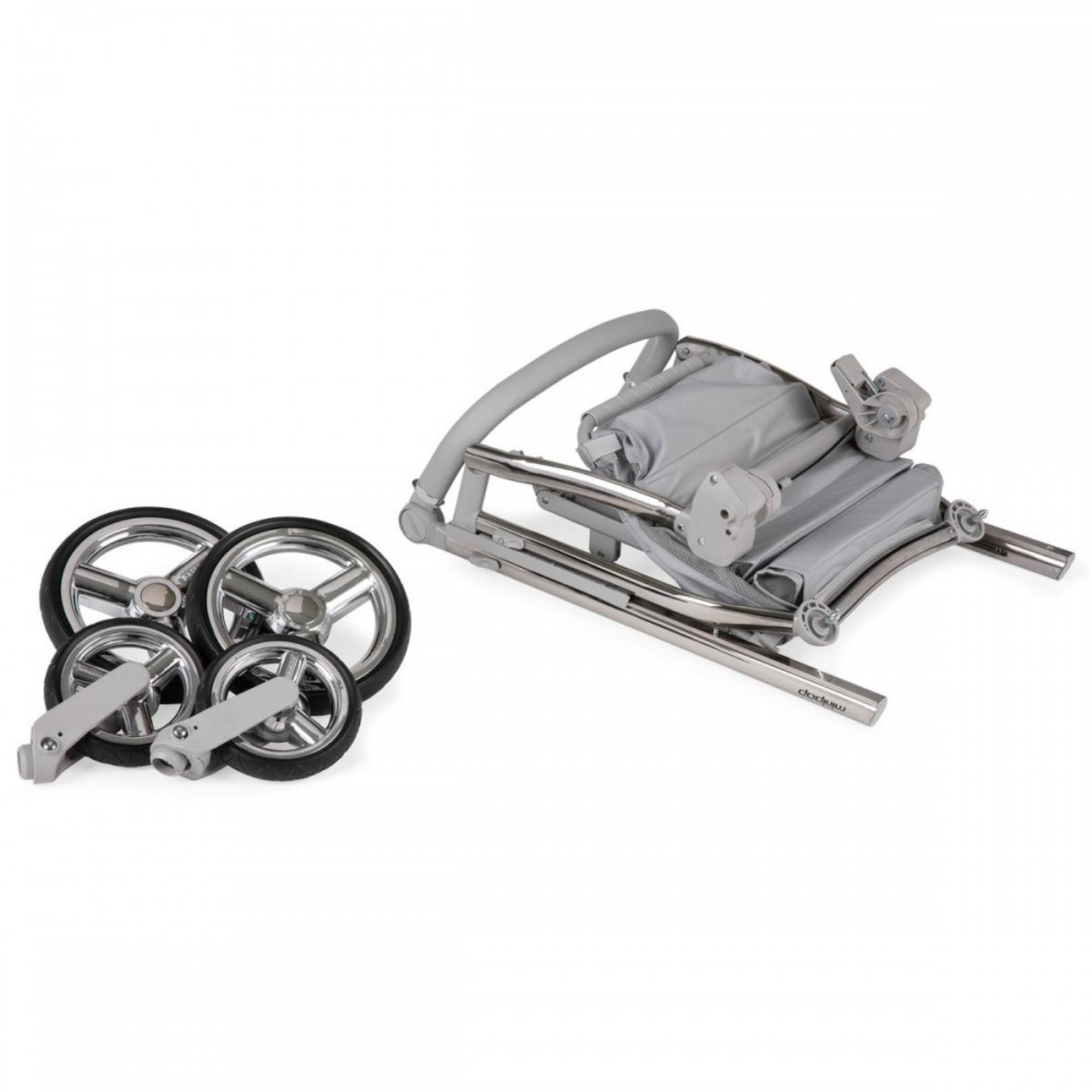 Ultra compact chassis with only 54cms wide. With four wheel suspension and wheels with ball bearings the pram can be manoeuvred with just one hand. The wheels are designed for an agile rise, they facilitate the action of going down and up stairs and absorb bumps, unevenness and irregularities on the surfaces. Easy to open and fold with seat unit attached either way. 7.5kg with basket.